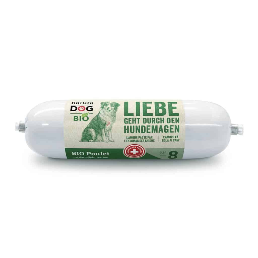 NaturaDog Bio Poulet avec terrine de pommes de terre est une nourriture humide de haute qualité pour chiens. Cet aliment complet contient déjà tous les ingrédients essentiels dont un chien a besoin pour un apport optimal et une alimentation naturelle et adaptée à son espèce. NaturaDog utilise exclusivement de la viande provenant d’exploitations agricoles suisses, des céréales sans gluten ainsi que d’autres ingrédients issus directement de la région.